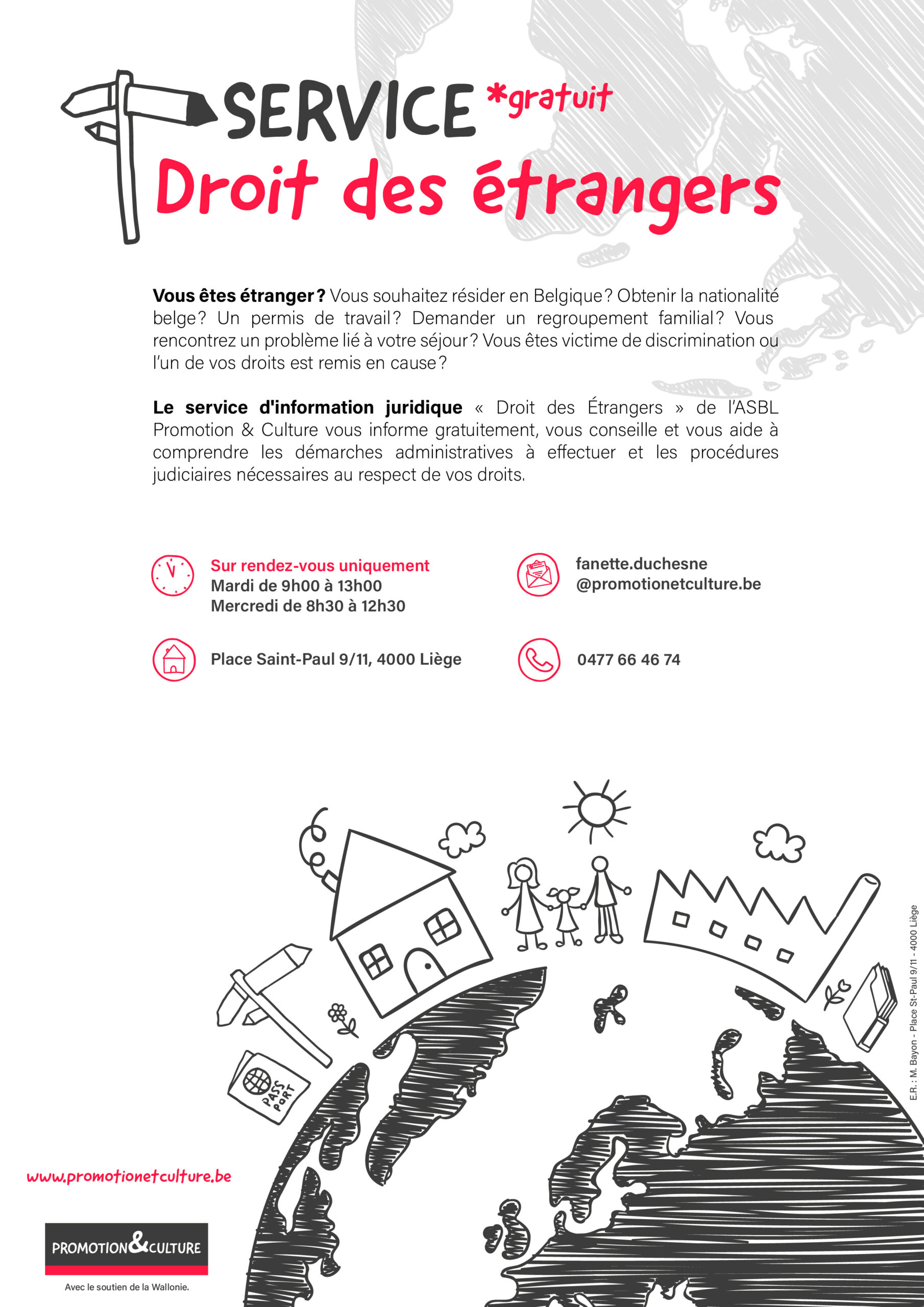 Afin d’aider à l’exercice des droits et des obligations des personnes étrangères ou d’origine étrangère ainsi que de toutes autres personnes concernées, Promotion et Culture assure une permanence juridique et un accompagnement social.